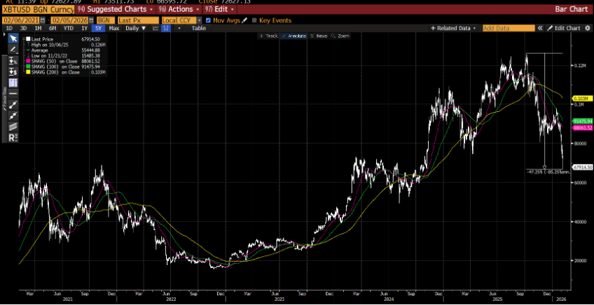 Bitcoin has fallen almost 50% and is now back to where it was when Trump took office. About 25% to 30% of the US population owns some form of Bitcoin. In Europe and Japan, those numbers are smaller, more like 10%. In any case, there is a wealth effect impact. This also may be a symptom—are households selling Bitcoin to raise cash?