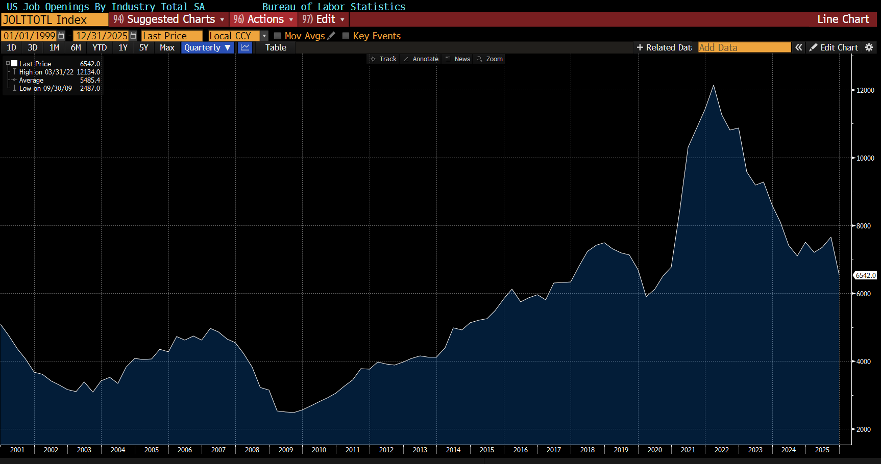 We know that there are two parts to the US economy: a wealthy upper tier responsible for most of the discretionary spending, and everyone else. The “everyone else” part of the economy is weak. Job openings are at their lowest level since COVID.